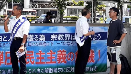 2024年7月、広島で解散請求に抗議する世界平和統一家庭連合(旧統一教会)の会員たち。