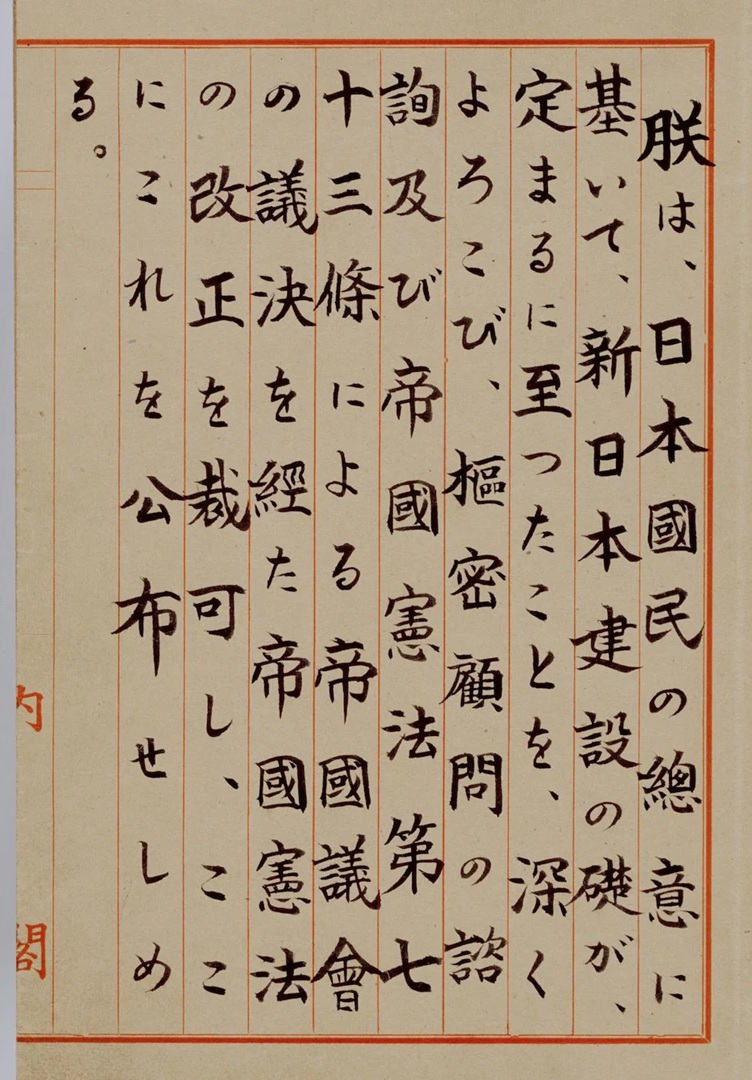 日本国憲の原本の最初のページ。天皇陛下の上諭が記されている。