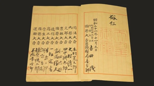 日本国憲法の原本。昭和天皇(裕仁、1901-1989)および国務大臣の署名入り。