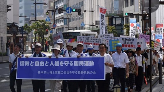 2024年7月21日、長野で宗教の自由を求めて行進する家庭連合のメンバー。